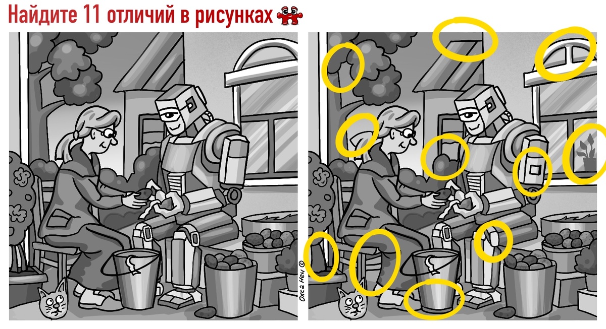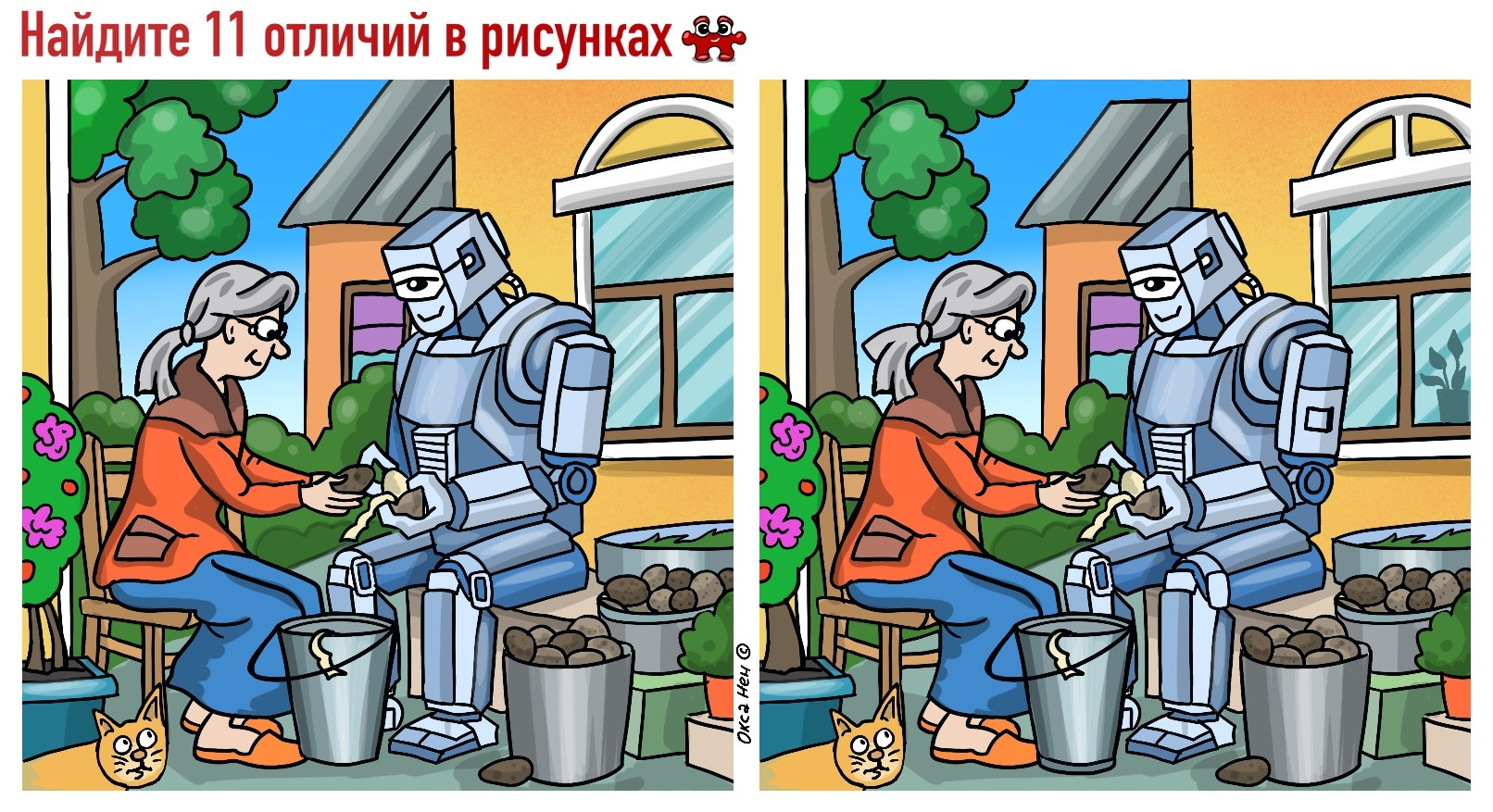На рисунке, на котором нужно найти 11 отличий, изображены бабушка и робот, который помогает ей чистить картошку. Одноглазый железный помощник собирается почистить 2 ведра картошки.