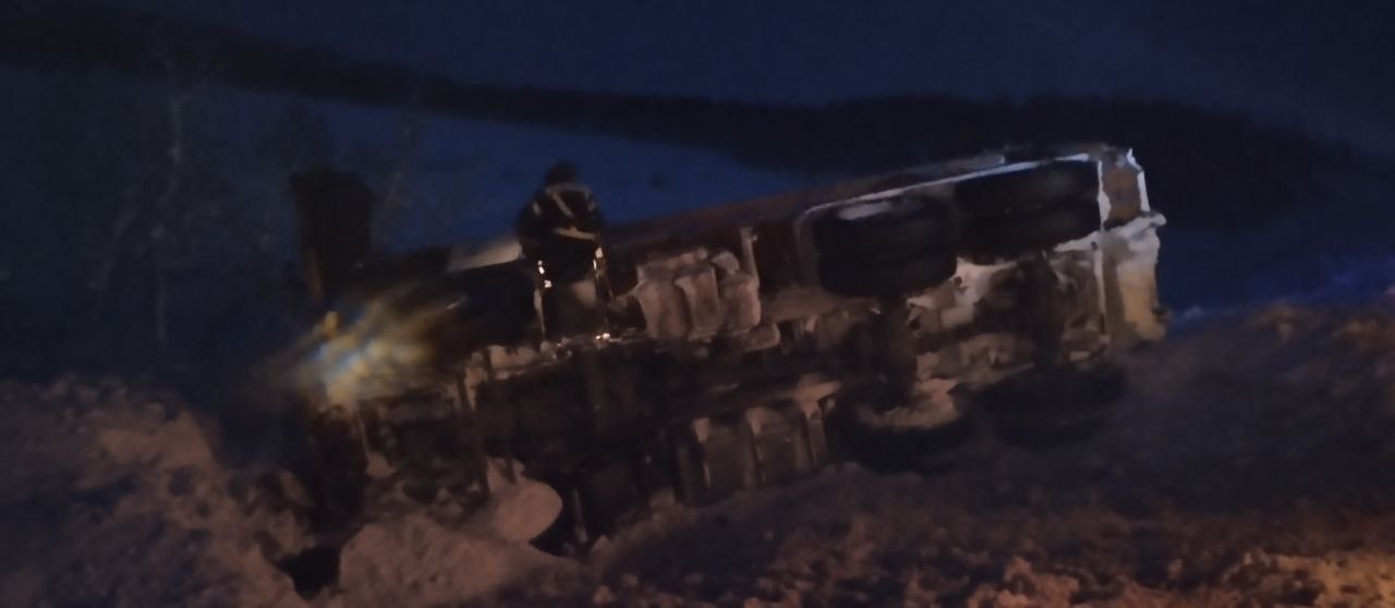 Утром в районе Междуречья произошло ДТП с участием грузовика SITRAK. Машина съехала в кювет и опрокинулась на бок.