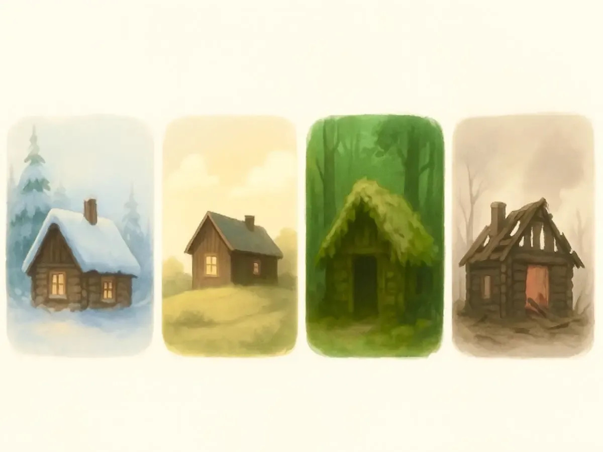 Визуальный экспресс-тест с избушками вдохновлён проективными методами Юнга и арт-терапией. Выберите для себя самый привлекательный рисунок, жить-то в них не обязательно. Какой домик на иллюстрации отражает ваше текущее настроение?
