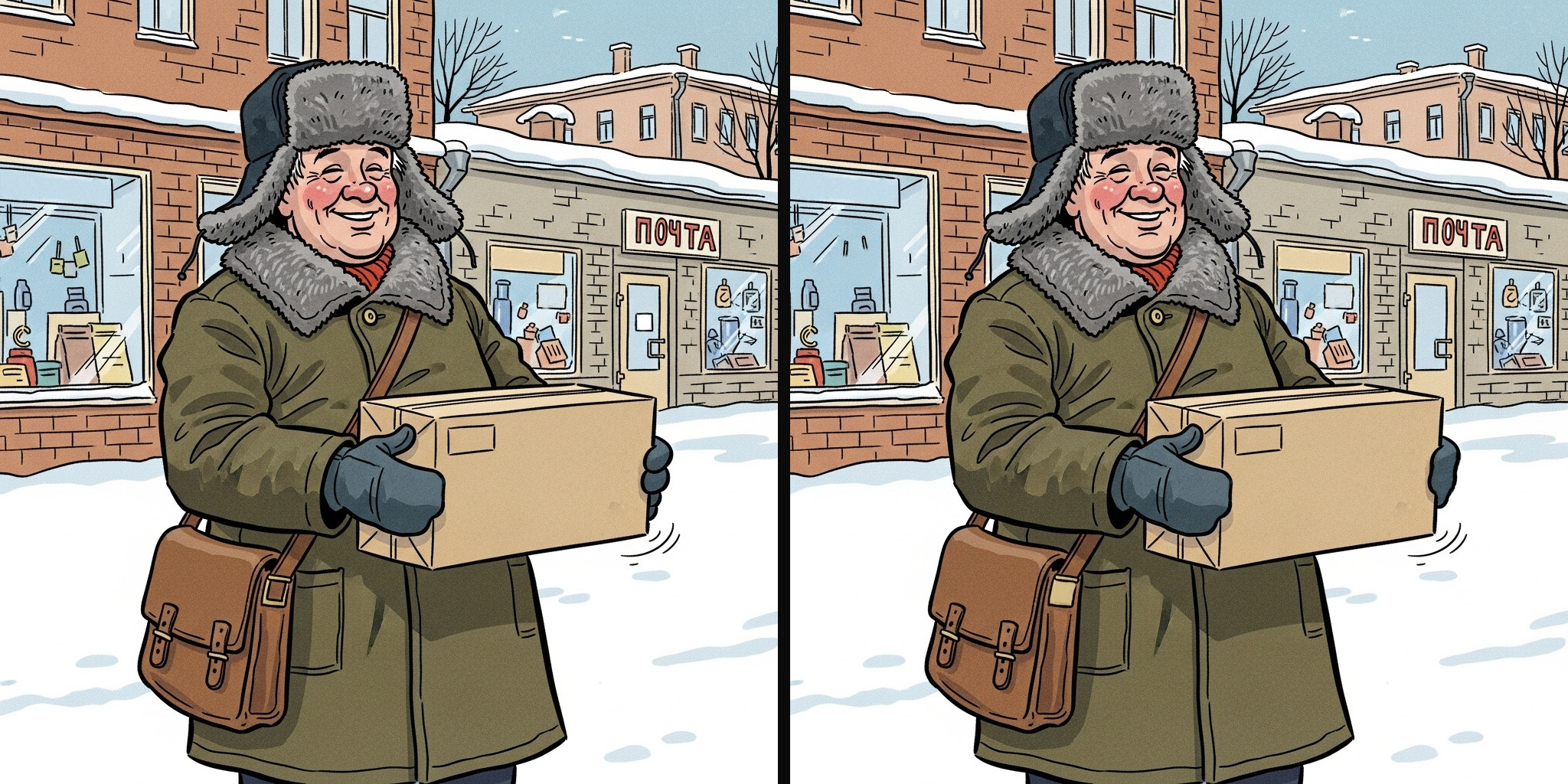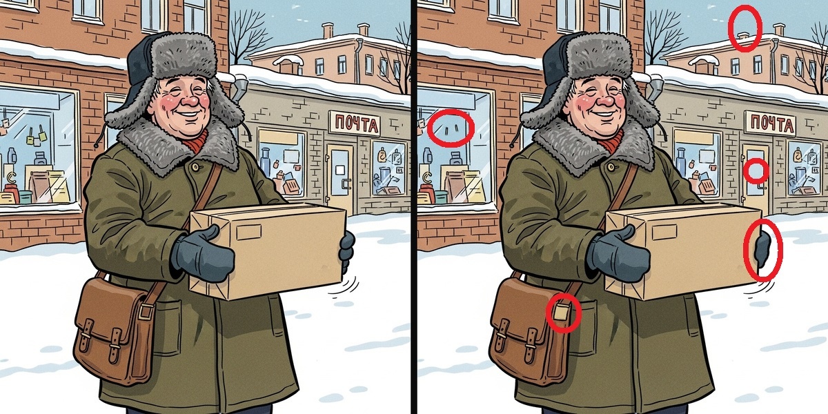 Итак, вы видите весёлого почтальона, который спешит разнести почту. Казалось бы, обе картинки идентичны, но стоит приглядеться, то сразу же отметите различия.