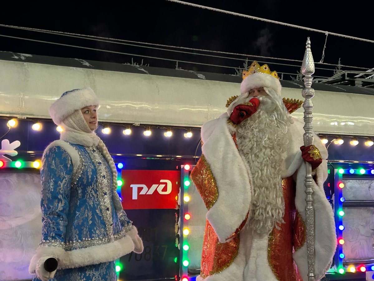 Затем к юным северянам из поезда вышли Дедушка Мороз и его внучка Снегурочка. Они поздравили всех с праздником и вместе с детьми загадали желания.