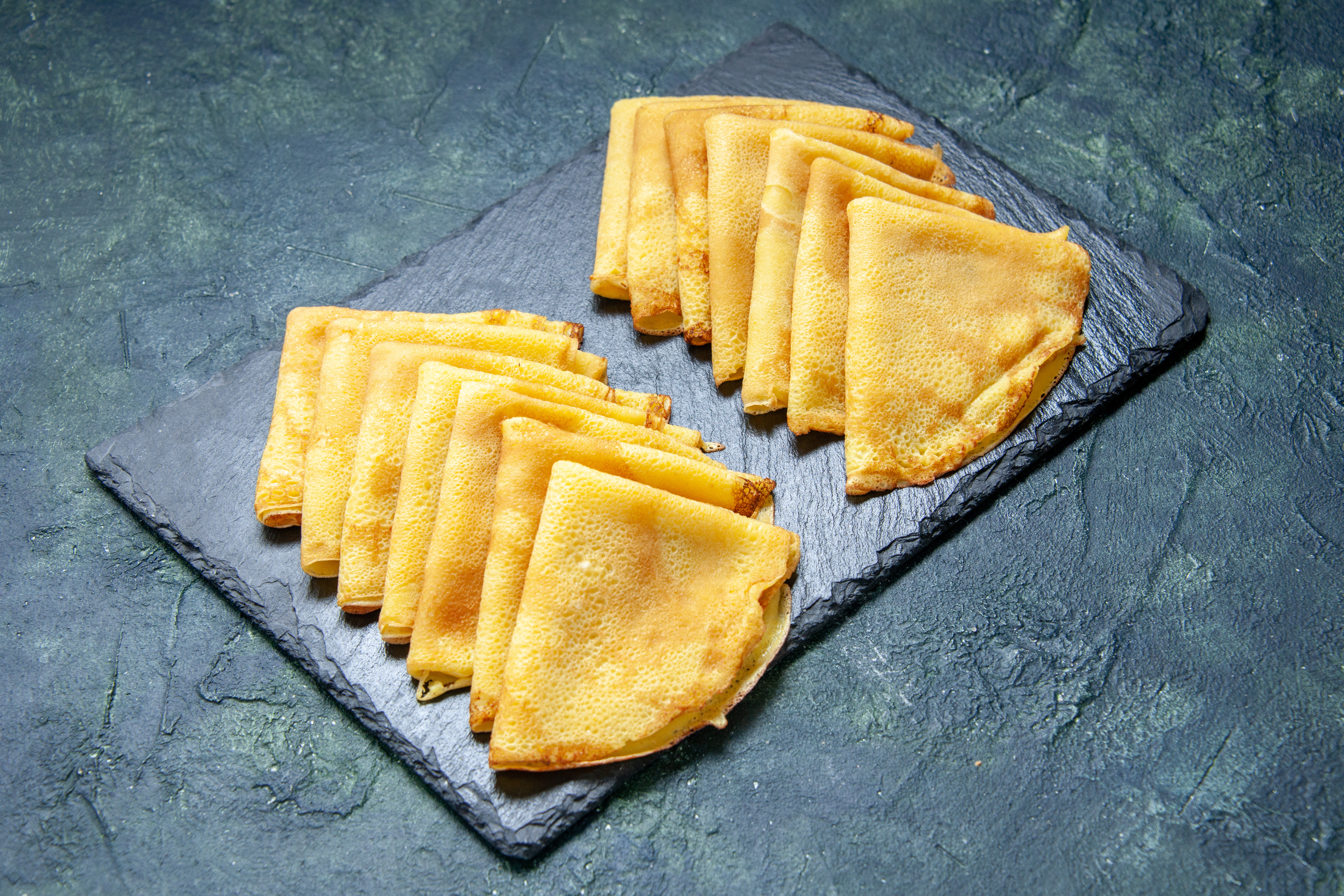 Блины с начинкой не просто готовятся, но и обжариваются на растительном масле особым способом. Для этого нужны 4 яйца, треть чайной ложки соли, немного муки для панировки.