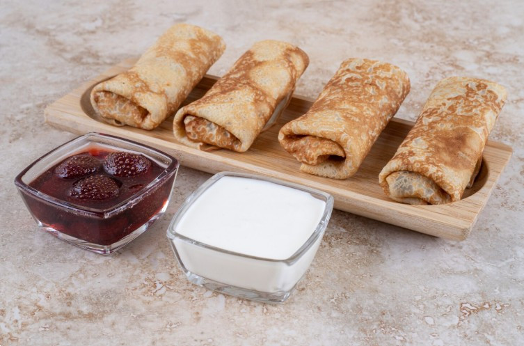 Блины можно приготовить по любому рецепту. У любой хозяйки есть наверняка свой любимый проверенный рецепт, вот по нему и следует их жарить. Когда блины будут готовы, в них надо положить начинку и свернуть трубочкой. Вот и все — можно есть. А что не съедите, то смело кладите в морозилку.