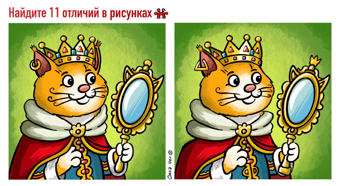 Кошечкам это тоже не чуждо. На рисунках, на которых нужно найти 11 отличий, изображена кошечка в короне и королевской мантии.