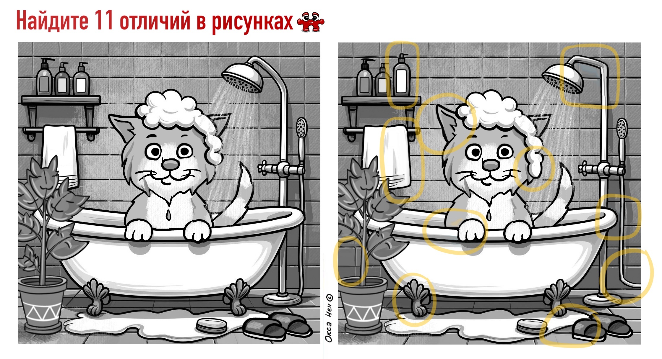 Когда я купала своего кота, мне иногда казалось, что в него вселяются бесы. На рисунках, на которых надо найти 11 отличий, котик с удовольствием моется в ванной.