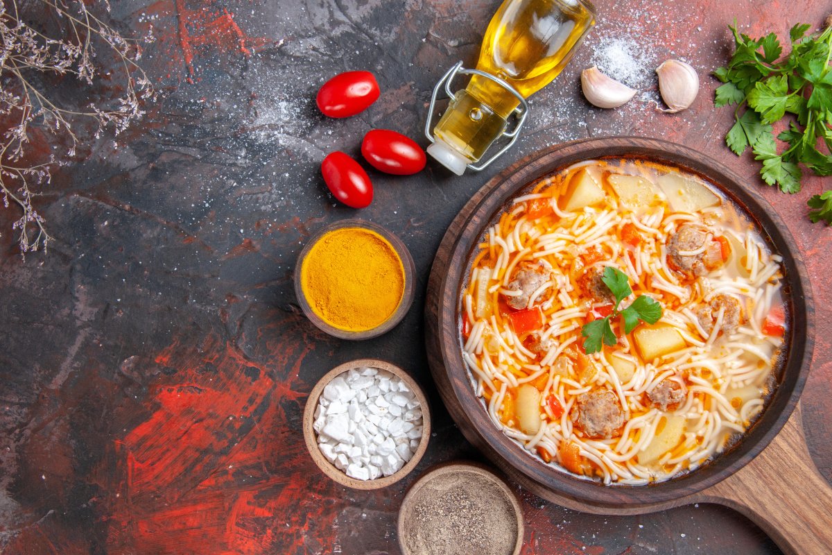 Для приготовления нужны 600 гр мяса, 2 картошки, 1 морковь, 1 редька, 2 луковицы, 3 л воды, немного соли, перца, сушёного чеснока, укропа и базилика, 2 столовых ложки томатной пасты, 2 листика лаврушки. Также понадобятся 400 г лапши и 2 столовых ложки растительного масла.