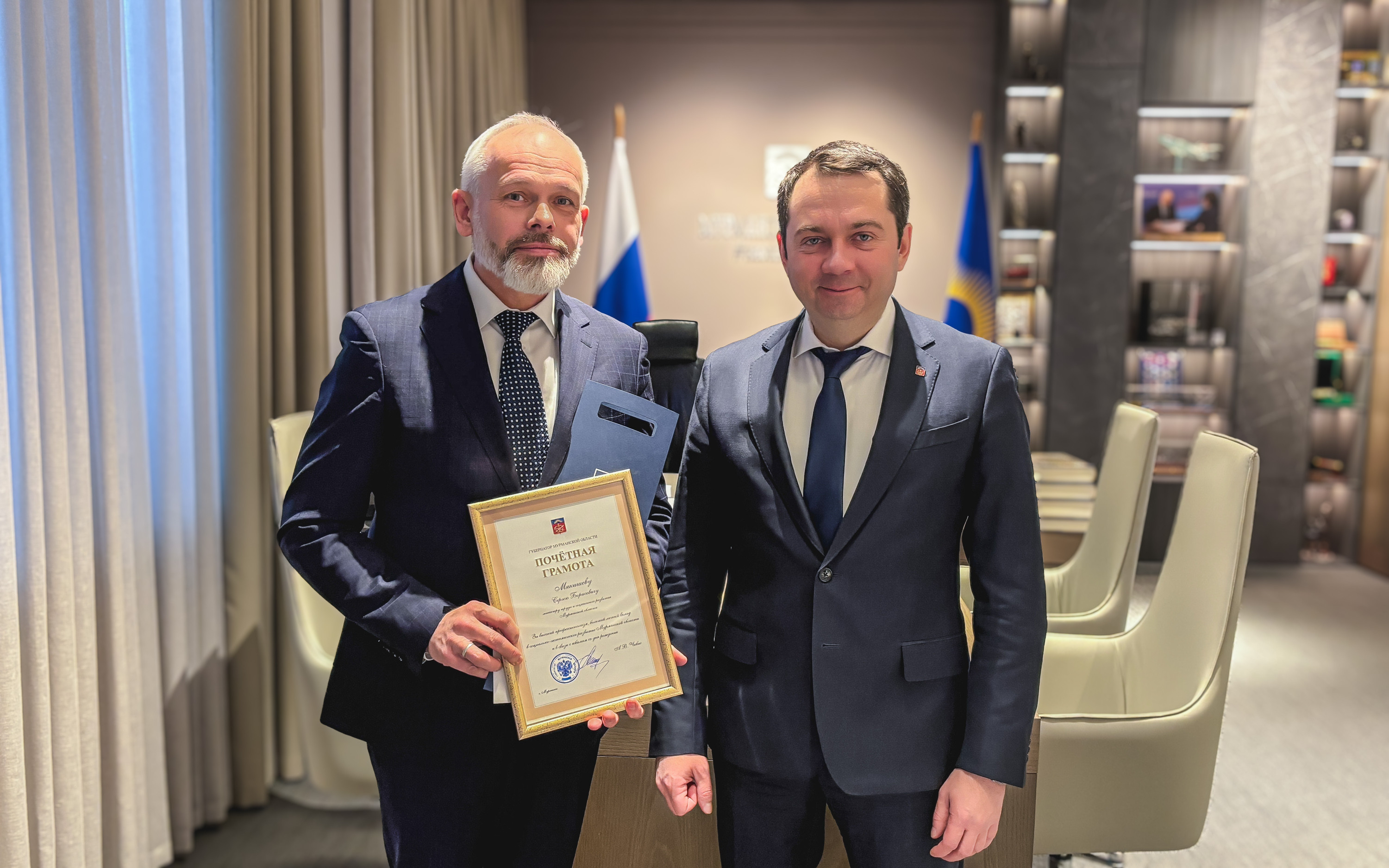 Министра труда и социального развития Мурманской области Сергея Мякишева поздравил с днем рождения губернатор Андрей Чибис. По этому случаю он вручил имениннику награду. За успехи и достижения в труде юбиляра наградили почетной грамотой.