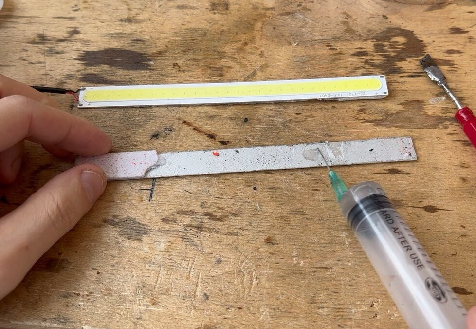 Когда всё подготовили, просто наносим ксилол на остатки скотча с помощью шприца с затупленной иглой и ждём 2-3 минуты, пока клеевой слой размягчится. После этого счищаем остатки скотча пластиковой картой или мягкой пластиной, чтобы не поцарапать поверхность детали.