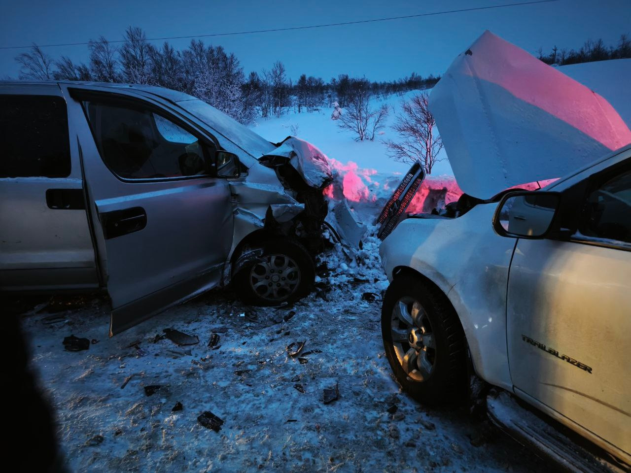 Согласно предварительным данным Госавтоинспекции, водитель двигавшегося со стороны Териберки микроавтобуса Hyundai Starex не справился с управлением, выехал на полосу встречного движения и столкнулся с легковым автомобилем Chevrolet.
