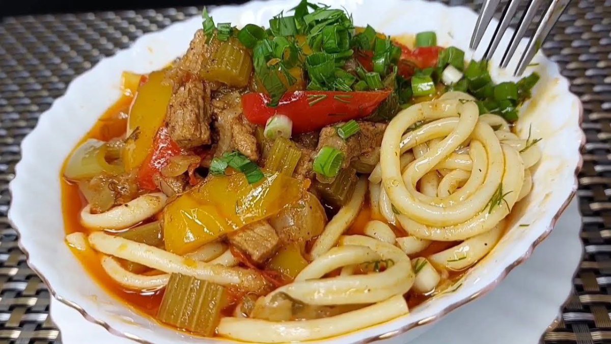 Лагман — ароматное, сытное и вкуснейшее блюдо родом со Средней Азии. Готовить его несложно, но сегодняшний рецепт ещё проще классического. Вам не придётся тратить время на отдельные манипуляции с тестом.