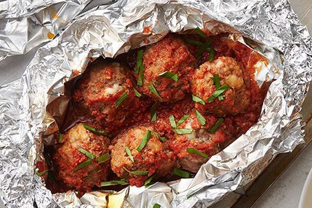 Далее из него формируем шарики, выкладываем их на фольгу, посыпаем рубленой зеленью и заливаем смесью кетчупа и томатного сока.