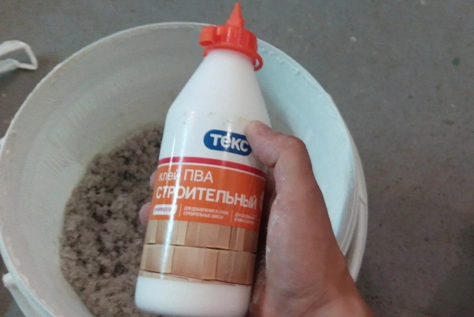 Строительный (а не школьный) с пометкой «МБ» ПВА делает смесь эластичнее, повышает адгезию (сцепление) и не даёт покрытию отслаиваться.