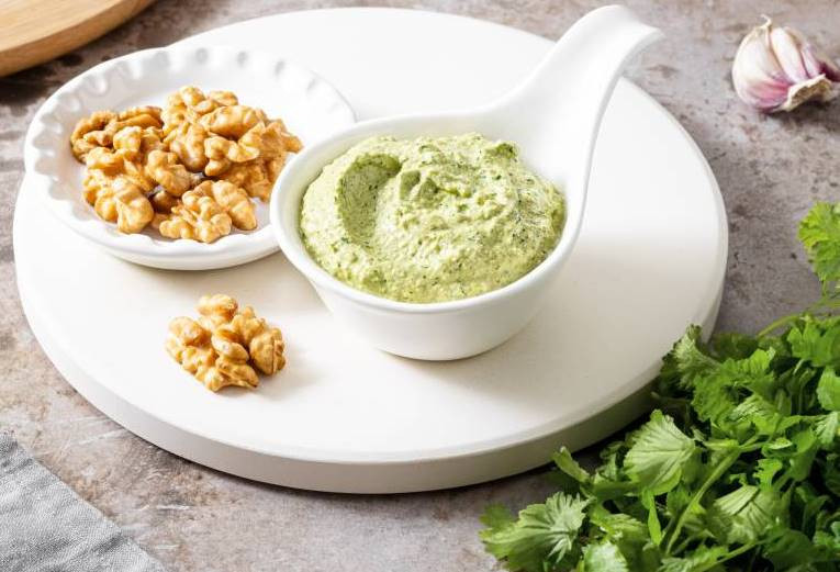 Чтобы его приготовить понадобятся: сами грецкие орехи (0,5 кг), 2 зубчика чеснока, 1 пучок кинзы, 5 г хмели-сунели, 3 г шафрана, винный уксус или гранатовый сок (1 чайная ложка) и соль (по вкусу).