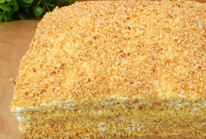 Завершающий этап: коржи смазываем кремом и укладываем слоями и сверху посыпаем измельчёнными в крошку обрезками выпечки.
