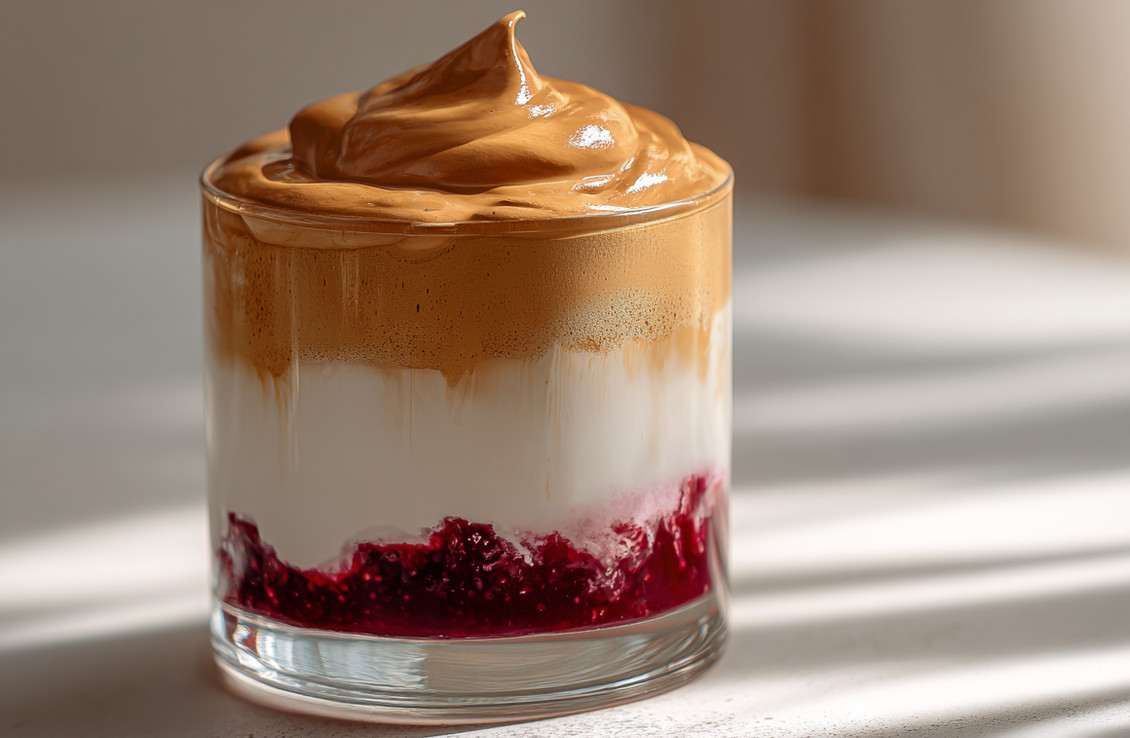 Сегодня же дальгона существует в разных вариациях. Одним из самых вкусных и любимых многими вариантов является дальгона «Ягодный чизкейк», в основе которого — фруктово-ягодный джем, молоко и сливочный сыр, а сверху — воздушная кофейная шапка, создающая баланс сладкого и горького.