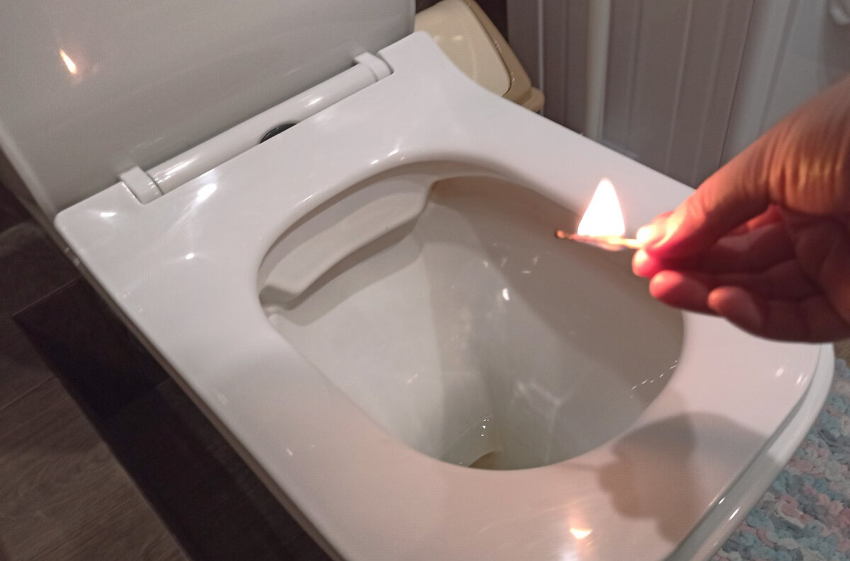 Чтобы не ставить себя в неловкое положение, стоит воспользоваться таким способом: после «посещения» унитаза надо зажечь над ним спичку и дать ей догореть. Запах моментально исчезает, потому что у серы есть свойство выжигать все неприятные зловония в округе.