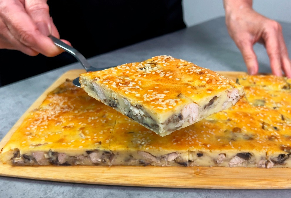 Вам когда-нибудь приходилось печь пирог, начиная процесс с приготовления начинки, потому что на подготовку теста понадобится всего 2-3 минуты? Сегодня мы будем печь именно такой пирог, который из-за специфического теста можно назвать «заливным», а в качестве начинки у нас — курица и грибы.