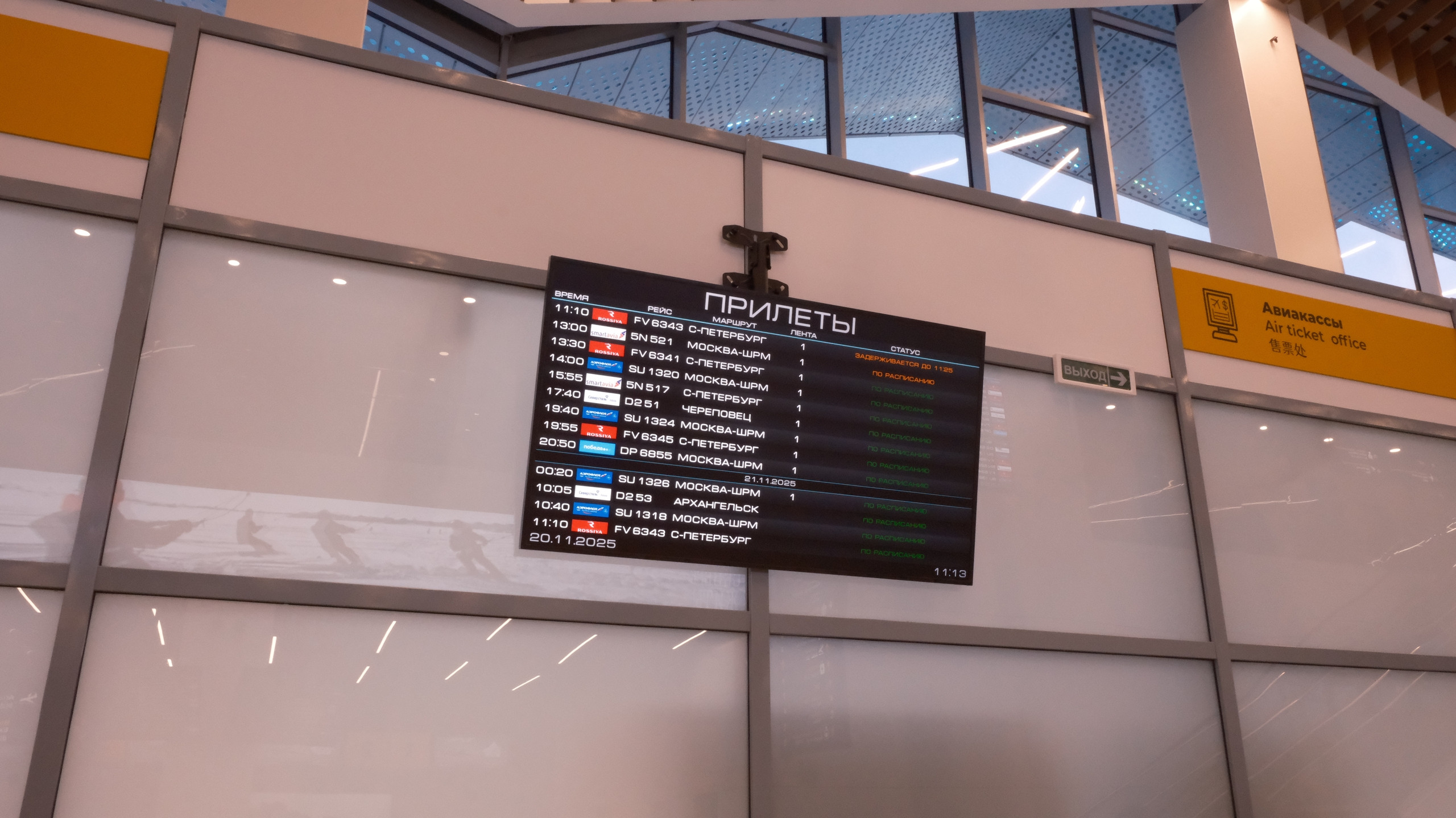 Задерживается прибытие двух рейсов из Москвы: SU 1320 авиакомпании «Аэрофлот» из Шереметьево приземлиться в Мурманске в 16:40 вместо 14:00, 5N 521 авиакомпании Smartavia из Шереметьево прибудет в 16:50 вместо 13:00. Их вылет в обратном направлении также состоится позже — 17:30 (SU 1320) и 17:34 (5N 522) соответственно.