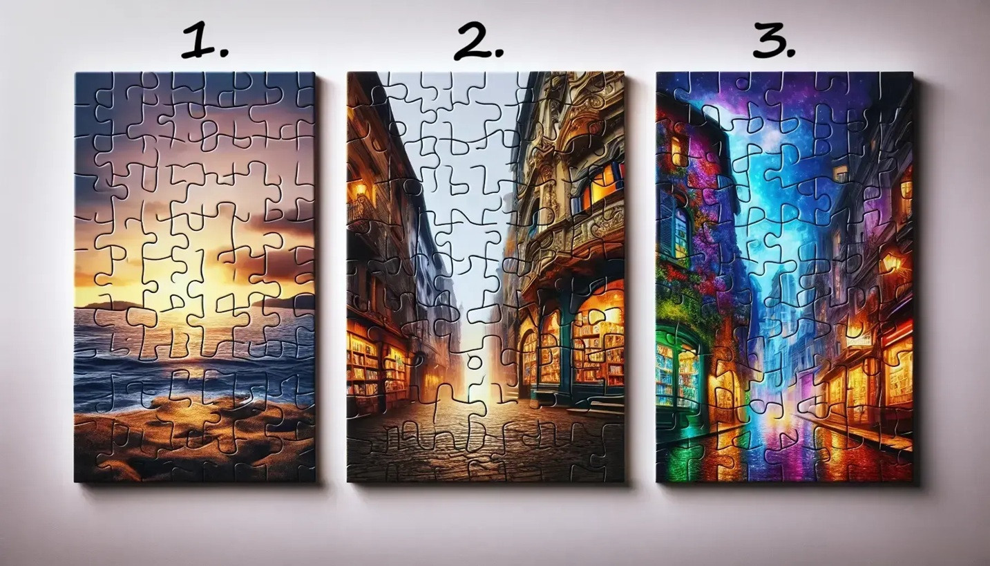 Перед вами творческая иллюстрация. Какую из этих трех картин-пазлов вы бы выбрали для спокойного вечера? Доверьтесь первому импульсу и узнайте, что это говорит о вашей жизни.