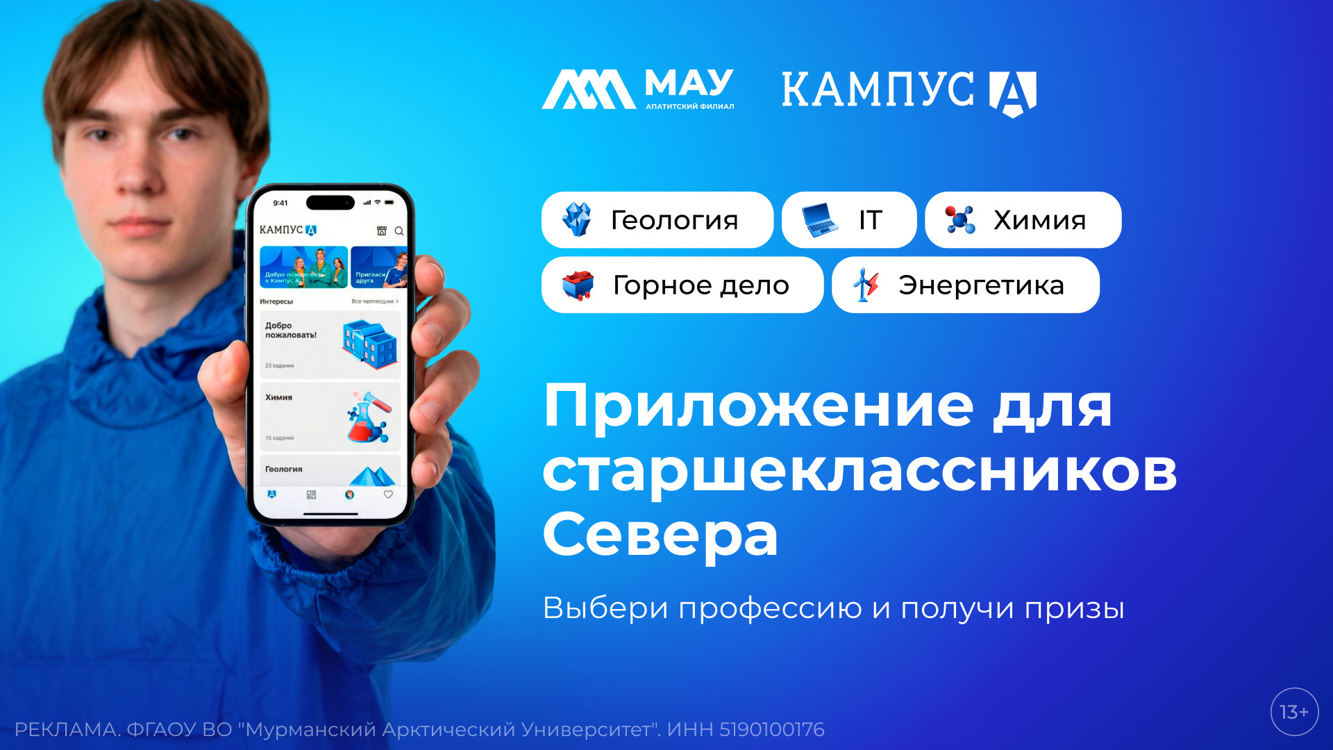 Апатитский филиал Мурманского арктического университета объявляет о запуске мобильного приложения Кампус А, первой в регионе геймифицированной платформы профориентации для учеников 9–11 классов. Приложение доступно для скачивания старшеклассникам из всех населённых пунктов Мурманской области и соседних регионов.