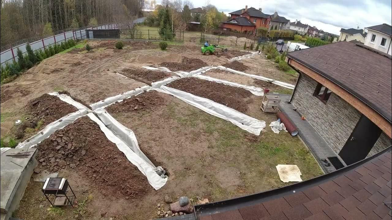 Составьте план от руки, где отметьте нахождение лотков, самую высокую и низкую точки. Выберите тип дренажа. Точечный делают в местах, где скапливается вода в лужи. Если она стоит по всему участку, нужен линейный — с решётками вдоль дорожек.