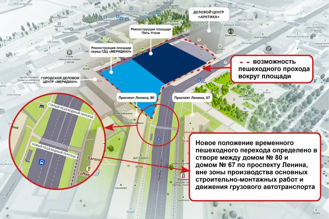 По его словам, привычный пешеходный переход через проспект «Ленина» между домами № 80 и № 67 будет перенесён ближе к остановочному комплексу. Проход вдоль ГДЦ «Меридиан» и через арку на улицу Самойловой будет сохранён.