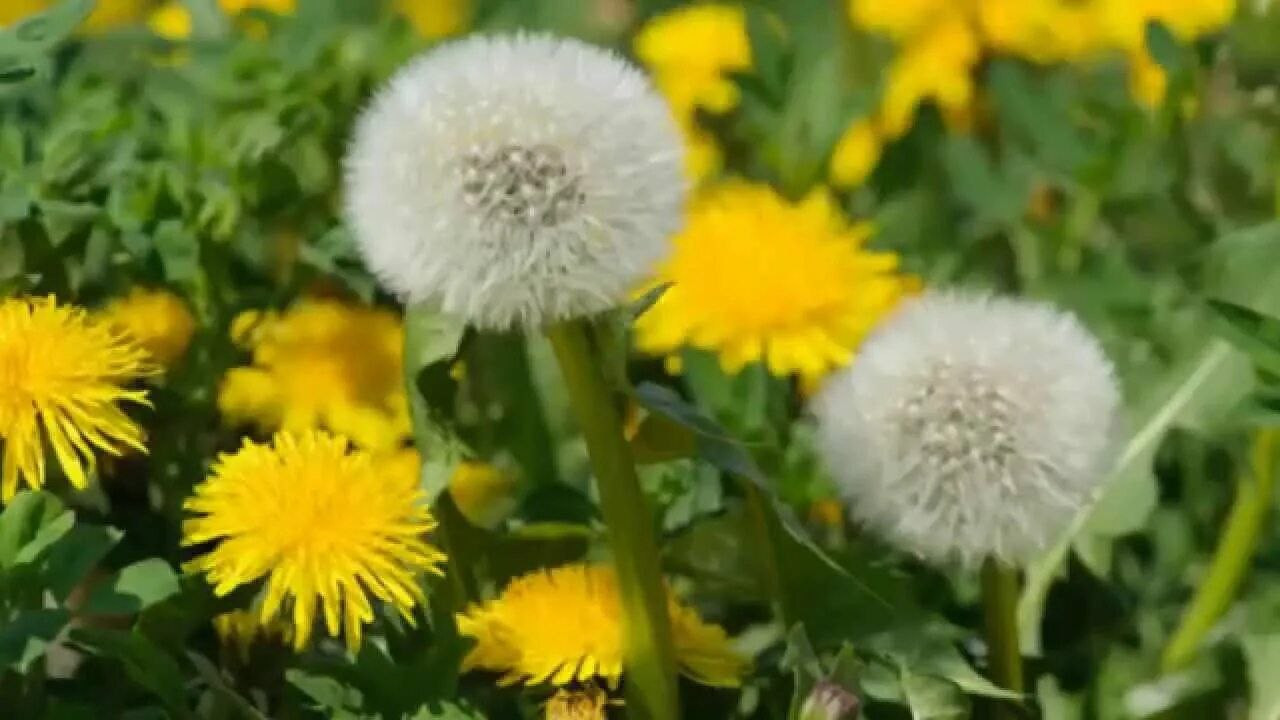 цветущие желтые и пушистые семенные одуванчики