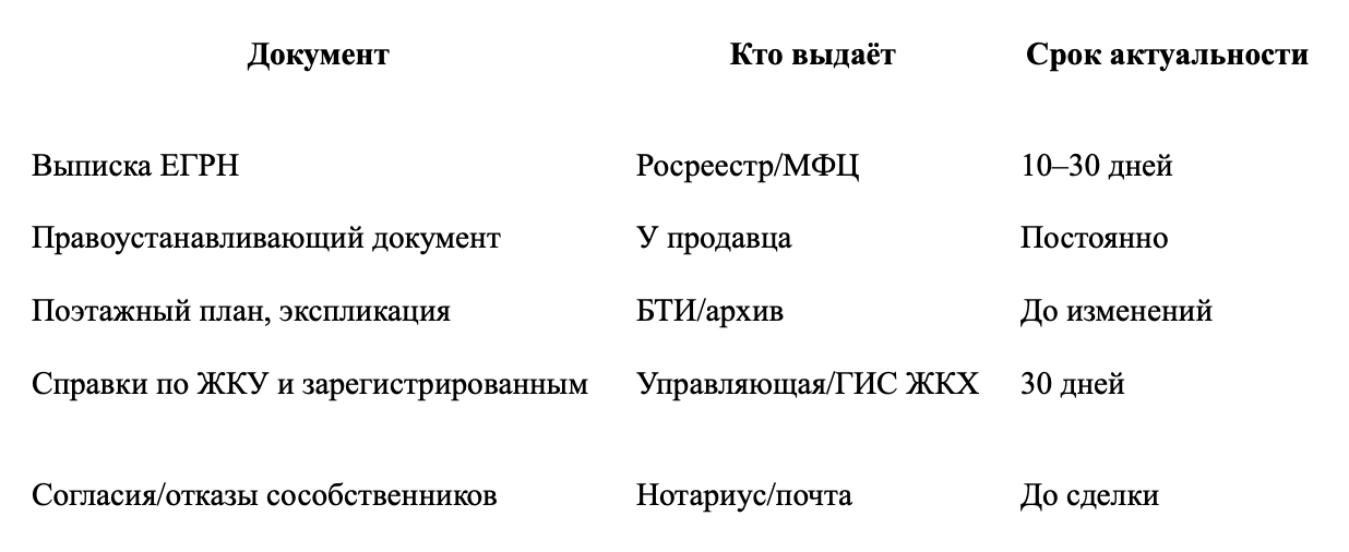 Ключевая мысль проста: подтверждаем право, состав объекта, людей и деньги. Выписка из ЕГРН покажет собственника, обременения, кадастровый номер комнаты, а не абстрактной доли. Правоустанавливающий документ раскроет историю – дарение, купля-продажа, приватизация. Полезно увидеть поэтажный план: где стена, где окно, где «мокрые зоны». Справки по коммунальным платежам снимают риск старых долгов. И да, при доле – документально фиксируем уведомления соседей.