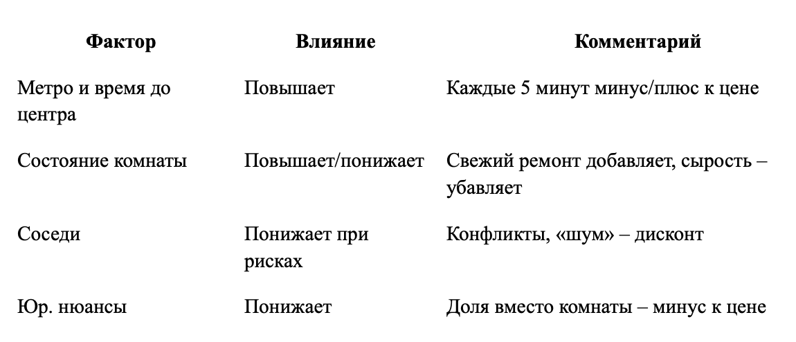 Сравниваем аналоги по площади, состоянию, расстоянию до метро и составу соседей. Делаем поправки на ремонт, этаж, санузлы, юридические риски – и получаем коридор цены.
