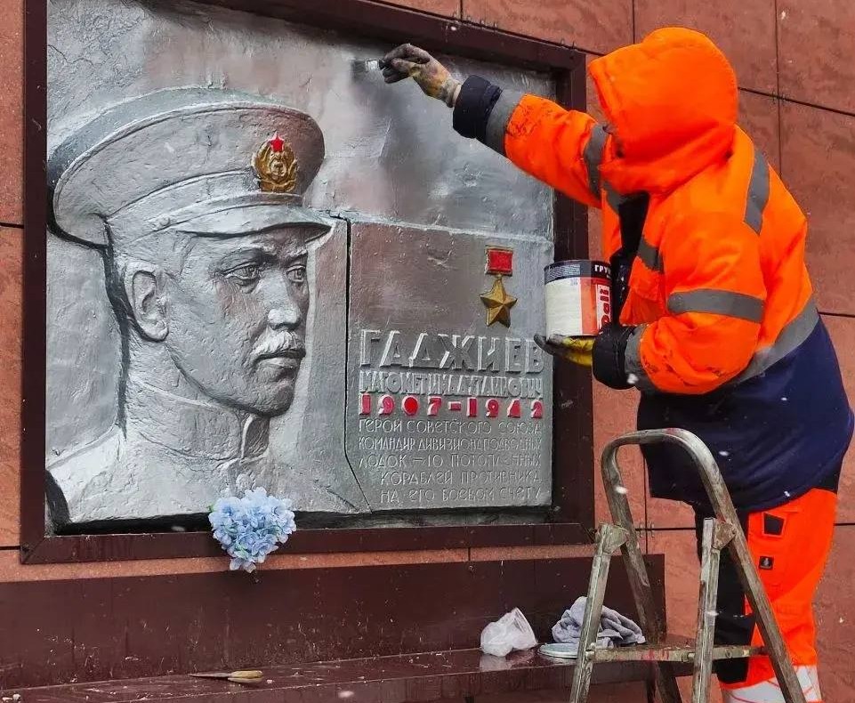 Памятную доску легендарному подводнику, Герою Советского Союза Магомету Гаджиеву на доме №2\47 на одноименной улице в Мурманске отреставрировали. Реставрационными работами занимались работники Управления дорожного хозяйства. Памятный знак обновили в преддверии праздничных мероприятий, посвященных Дню Победы, сообщил глава Мурманска Иван Лебедев.